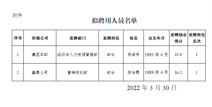 根 據 《 瀘 州 阜 陽 投 資 集 團 有 限 公 司 關 于 2022 年 部 分 中 層管理崗位內部競聘的公告》 的規(guī)定,經阜陽集團黨委研究 決定, 擬聘用楊澤芳、 陳怡霖為瀘州阜陽投資集團有限公司 中層管理人員。 現面向社會公示 3 個工作日, 公示時間 2022 年 3 月 30 日至 2022 年 4 月 1 日。 公示期間, 如有問題, 請 及 時 向 瀘 州 阜 陽 投 資 集 團 有 限 公 司 組 織 與 人 力 資 源 管 理 部 反映。 要求舉報者署實名, 實事求是地反映問題, 并提供必 要的調查線索。