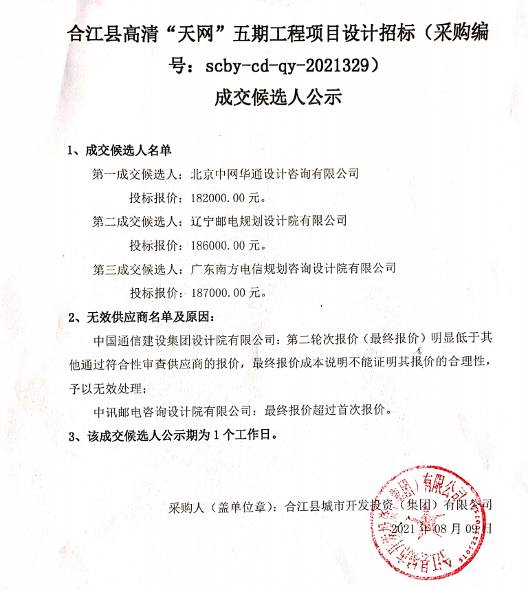 合江縣高清“天網(wǎng)”五期工程項目設計招標成交候選人公示