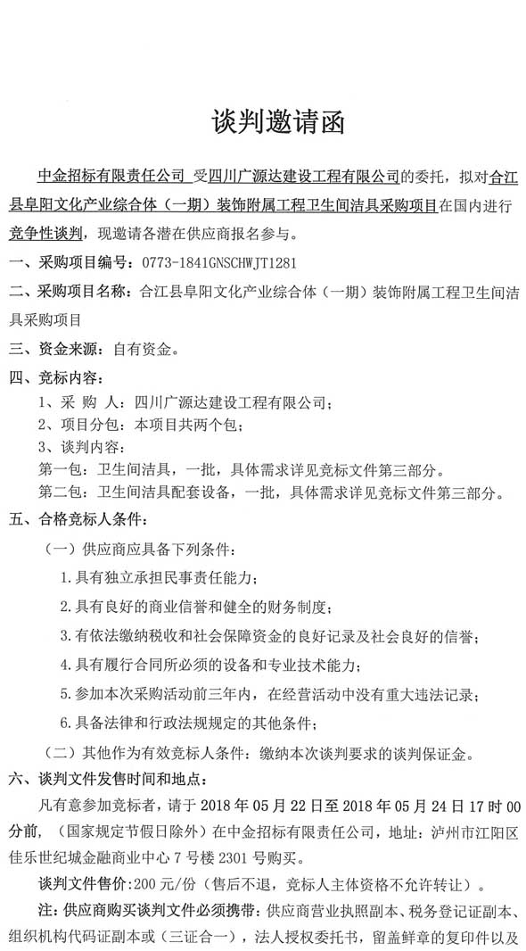 談判邀請函(合江縣阜陽文化產(chǎn)業(yè)綜合體(一期)裝飾附屬工程衛(wèi)生間潔具采購項目).doc