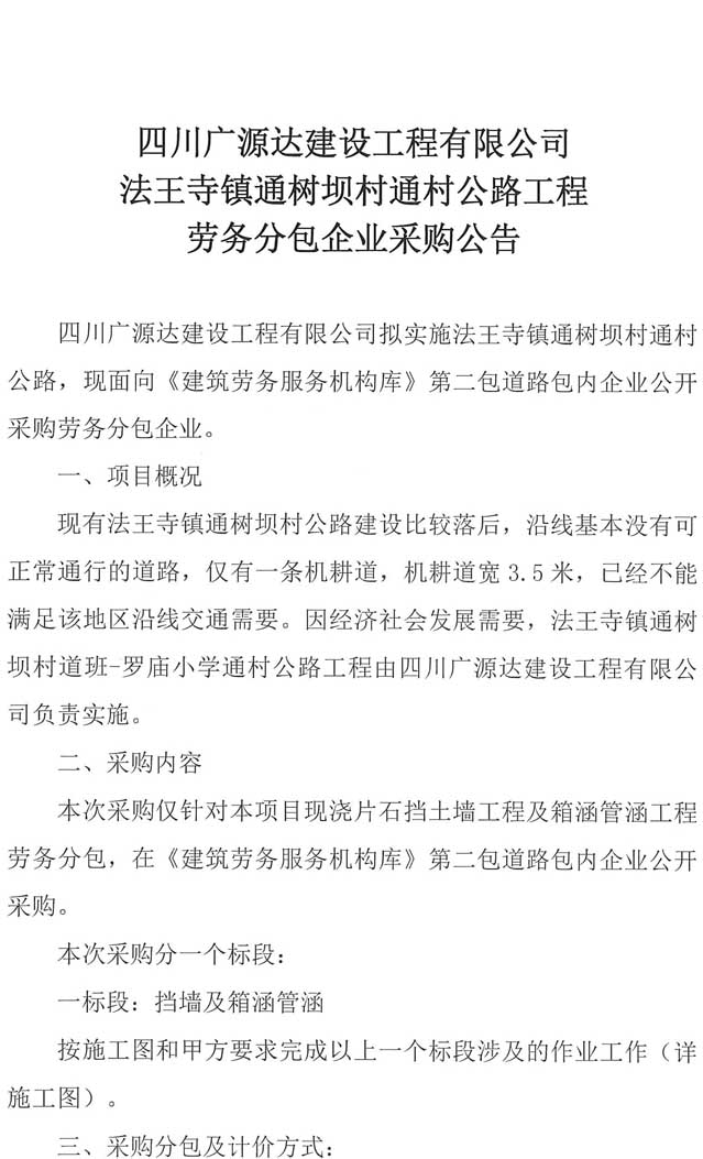 四川廣源達建設工程有限公司法王寺鎮(zhèn)通樹壩村通村公路工程勞務分包企業(yè)采購公告.doc