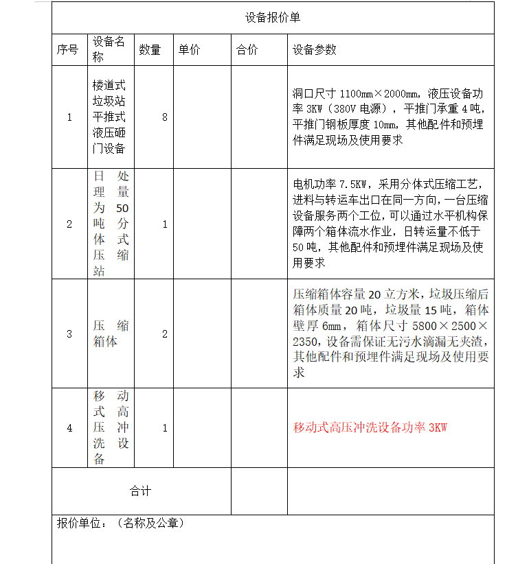 二、詢價內(nèi)容:1、樓道式垃圾站平推式液壓砸門設(shè)備及其配件8套;2、20立方米分體式壓縮站(包含一臺壓縮機構(gòu)、兩個箱體、一套水平移動機構(gòu)、移動式高壓清洗設(shè)備一套)及其配件1套(配套原有勾臂車使用)
